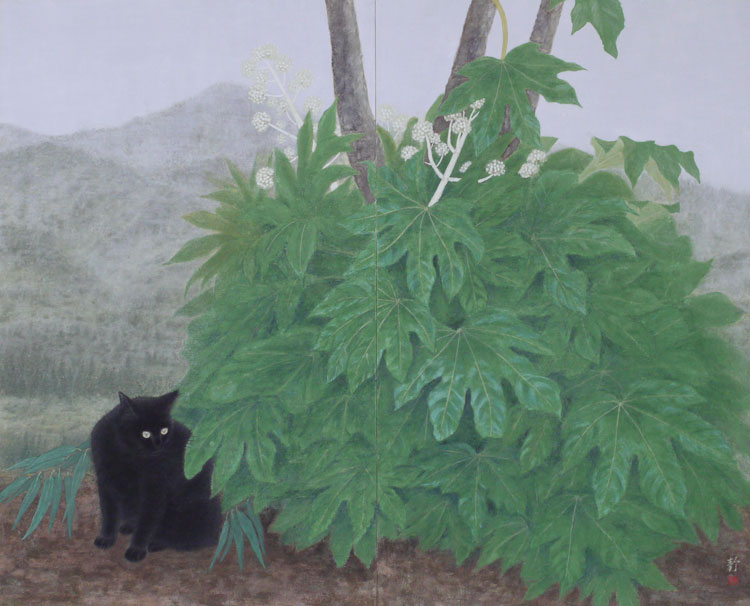 「庭の八つ手と遠くの山々を背景に。」